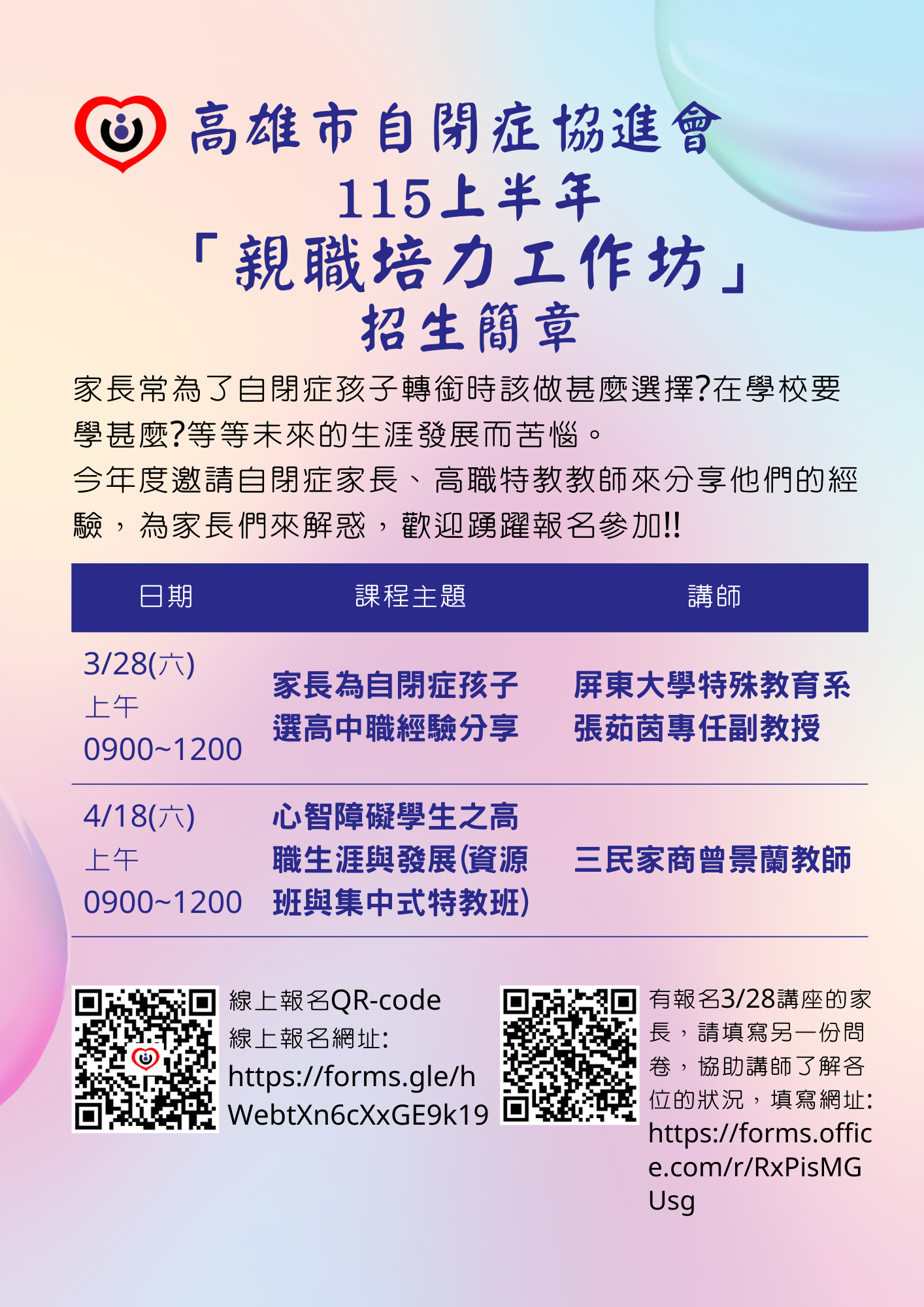 今年度邀請自閉症家長、高職特教教師來分享他們的經驗,為家長們來解惑,歡迎踴躍報名參加!!